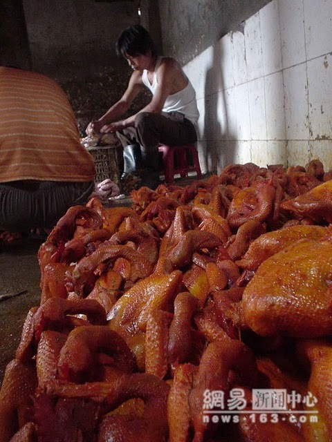 Đột nhập lò chế biến gà tại TQ, người ta tận mắt chứng kiến cảnh ngổn ngang những con gà chết được vất bừa bãi trên nền nhà, ngoài sân. Có 4 người chuyên nhúng gà vào nước sôi và vặt lông. Sau đó, dùng xà phòng và thuốc tẩy để làm sạch rồi tẩm mầu.