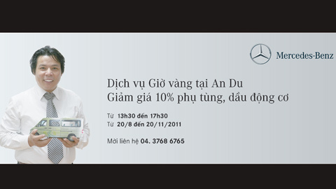 Từ 20/8 đến 20/11/2011, chiến dịch “ Dịch vụ Giờ vàng” do An Du thực hiện sẽ mang đến hỗ trợ “3 trong 1” dành cho khách hàng đến với An Du Autohaus. Cụ thể: Chương trình dành cho xe cũ trên 5 năm(Từ nay tới hết ngày 30/10/2011): • Giảm 10% tiền dầu động cơ. • Giảm 20% tiền phụ tùng chính hãng Mercedes Benz • Giảm 20% tiền công dịch vụ. Chương trình cho xe dưới 5 năm(Từ nay tới hết ngày 20/11/2011): • Giảm 10% tiền phụ tùng chính hãng Mercedes Benz • Giảm 10% tiền dầu động cơ. Chương trình dành cho khách hàng đặt chỗ trước • Khách hàng sẽ nhận được 01 coupon trị giá 1,000,000 VNĐ sau 05 lần sử dụng hệ thống đặt chỗ của An Du. |