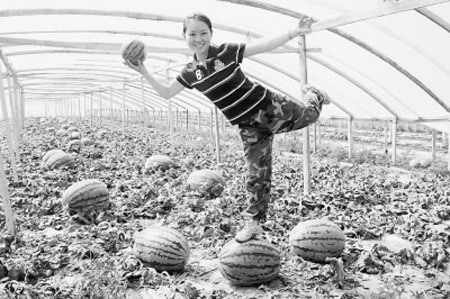 | Cô con gái của anh Trương đứng trên một quả dưa có kích thước khủng để múa ba lê. |