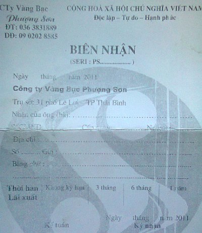 | Mẫu giấy biên nhận tiền gửi của hiệu vàng Phượng Sơn. |