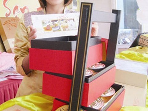 đồng/ hộp. Bánh được đặt trong những hộp gỗ, bên ngoài được mạ vàng óng.