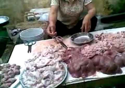 | Nếu là khách hàng lạ vào chợ, sẽ không khỏi giật mình kinh sợ vì những bộ lòng lợn con còn nguyên hình dạng, chưa được bóc tách này. |