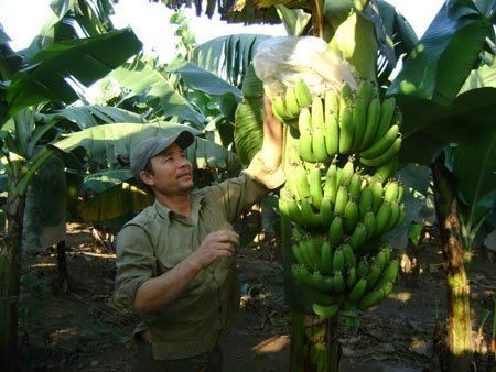 "Trồng chuối không khó, chuối ít bệnh, vào mùa đông nên dùng túi nylon che sương cho buồng chuối, tránh quả chuối bị "cháy" sương. Mỗi khóm chỉ nên để một cây to khỏe nhất, nếu muốn ăn vụ hai nên chọn những mầm chuối to để lại, các mầm khác chặt hết để nó tập trung nuôi cây. Cây khỏe thì quả, nải mới to, thơm ngon"- anh Đán chia sẻ kinh nghiệm trồng chuối của mình.