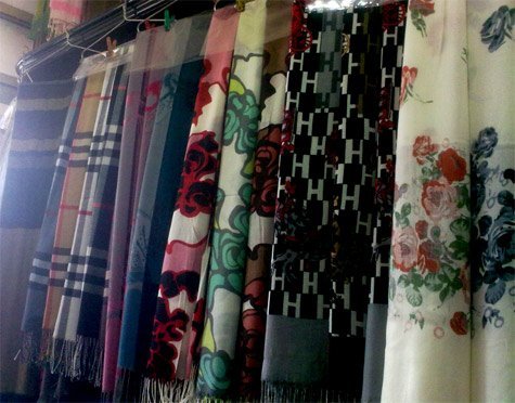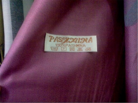 | Hầu hết khăn và quần áo tại làng Vạn Phúc này đều không có nhãn mác, hoặc nếu có chỉ là một tấm mác ghi nội dung chung chung: 100% Pashmina. |