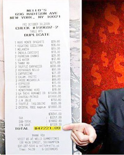 Trang TMZ.com đăng tải rất chi tiết hóa đơn dùng bữa của tỷ phú người Nga trong nhà hàng Nello ở New York. Dường như ra sức tầm bổ cho cô bồ Daria Zhukova bụng mang dạ chửa, Abramovich đã gọi rất nhiều món. Song những món đặc sản cho Daria và vài vị khách có may mắn được "bám càng" cũng chỉ chiếm 1/3 tổng giá của hóa đơn. 2/3 còn lại đến từ 2 chai rượu ngon dành cho nhân vật "chủ trì kiêm chủ chi". Tính cả 20% tiền "tip", bữa ăn thịnh soạn này có giá 47.221 USD. Abramovich còn hào phóng "bo" thêm 5.000 USD cho phục vụ.