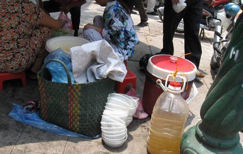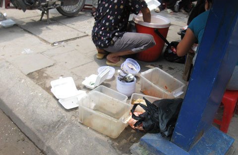 Tương tự ở nhiều quán gần trường ĐH Khoa học Tự nhiên, đồ ăn được chế biến tại chỗ trước mặt sinh viên. Đầu bếp chiên sườn, cá, trứng… trên chảo dầu đen kịt. Cạnh bên, chồng bát đĩa chất đống, rải rác các loại thịt, cá, rau, cơm thừa đổ tràn lan và bốc mùi kinh khủng.