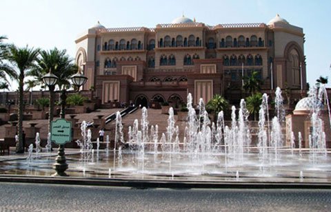 Emirates Palace nằm trên bãi biển cát trắng trải dài 1,3km tại thủ đô Abu Dhab, cách sân bay Dubai 1,5 giờ chạy xe. Với phong cách kiến trúc cung điện của các vị vua Ả Rập thời xưa, khách sạn được dát đá cẩm thạch, riêng tường và trần được dát vàng, bạc, cũng như được trang hoàng bởi những ngọn đèn chùm bằng pha lê Swarovski.
