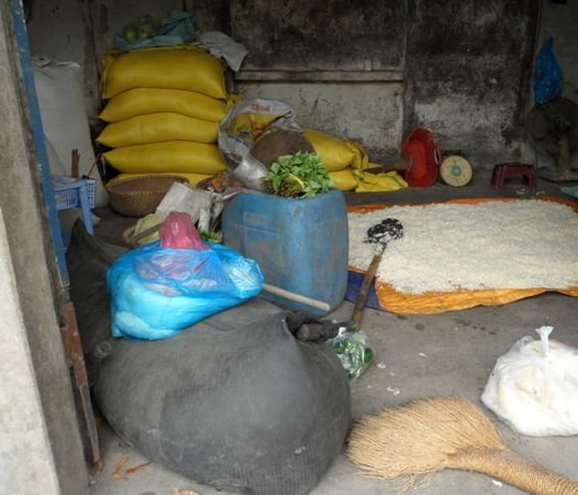 | Cơm dùng để ủ men nấu rượu sau khi nấu chín sẽ được đổ ra tấm bạt nhàu nhĩ, đen kịt ngay trên nền nhà nhếch nhác, bẩn thỉu để cho nguội và rắc men. |