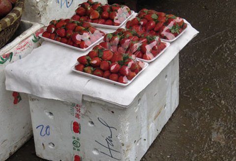 Dâu tây trên chợ Long Biên được bóc từ những thùng xốp có