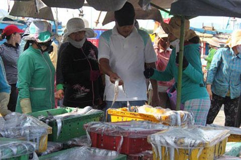 | Thương lái Trung Quốc Lin Da Quang (Lâm Tài Cường) chọn mua cá hố tại Cảng cá Vĩnh Lương. |