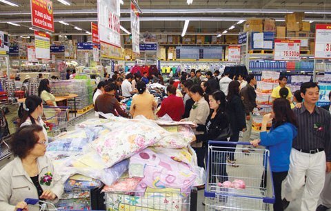 Từ ngày 30.12.2011, nhiều siêu thị tại TP.HCM đã phải mở cửa bán hàng buổi sáng sớm hơn một giờ và đóng cửa buổi tối trễ hơn một giờ mới đáp ứng được nhu cầu mua sắm của khách.