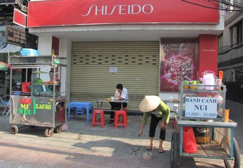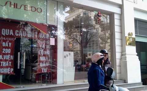Các cửa hàng treo băng rôn phản đối cách hành xử của Shiseido Việt Nam.