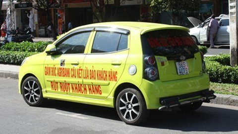 Sáng 5/3, hàng trăm người dân đã tụ tập đến xem chiếc xe hơi biển kiểm soát 56S – 4079 đậu trên đường Nguyễn Huệ, Q.1, TP HCM ghi hai bên hông xe và sau xe “tố” giám đốc ngân hàng Agribank cấu kết lừa đảo, rút ruột khách hàng.