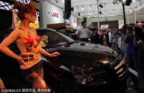 Cũng dùng gái đẹp sexy câu khách, một hãng xe hơi tại triển lãm ô tô mùa xuân Trịnh Châu, tỉnh Hà Nam,Trung Quốc đã “chiêu đãi” khách tham quan bằng “bữa tiệc” mẫu body painting "lả lơi" bên xế hộp.