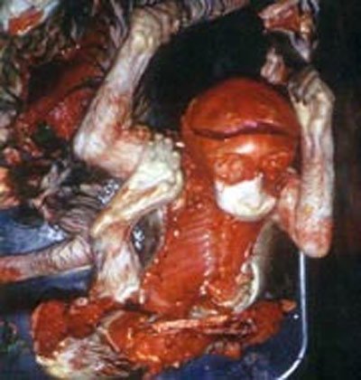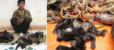 | Hình ảnh thê lương của con voọc bị chẻ sọ, rạch bụng lấy bào thai, lột da đem ngâm rượu. |