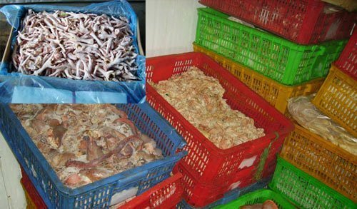 Nhìn dĩa chân gà ướp muối ớt nướng thơm phức, dĩa chân gà hấp hành trắng phau, dĩa gỏi chân gà trộn rau răm bắt mắt... thực khách khó mà biết rằng mặt hàng này cũng đã được chế biến theo công nghệ "tắm trắng". Hiện loại chân gà này phần lớn là hàng nhập khẩu, lâu ngày tiêu thụ không hết lại bảo quản không đúng kỹ thuật nên dễ bị hư hỏng, biến chất. Nguồn hàng này được các chợ đầu mối mua vào với giá rẻ, 1 kg chỉ hơn 20.000 đồng rồi đem bán ra thị trường.