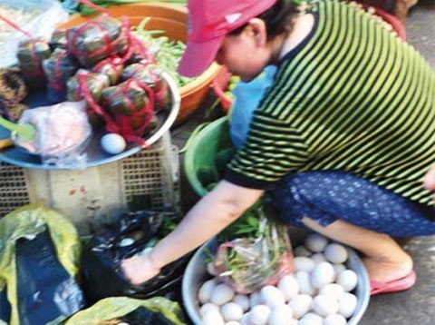 Tại một điểm bán trứng gà ở chợ Cầu, giáp ranh giữa Q.Gò Vấp và Q.12, hơn chục quả trứng gà ta và trứng ngỗng (theo lời người bán) được bày trong những khay nhựa, trứng gà có giá 32.000đ/chục (10 trứng). Người bán giới thiệu, trứng được thu mua tại các hộ nuôi ở Củ Chi (TP.HCM) và Long An, Bình Dương… Sau khi trả giá, chúng tôi được người bán chấp nhận mức giá 28.000đ/chục. Khi PV ngỏ ý muốn mua nhiều, người phụ nữ bán hàng gật đầu “bao nhiêu cũng có, vì đây là trứng mua ở các hộ nuôi nhỏ nên không có giấy kiểm dịch”. Tuy nhiên, theo bà Nguyễn Thị Lâm, một hộ nuôi gà ta quy mô nhỏ tại xã Minh Long, huyện Chơn Thành (Bình Phước) hiện giá trứng gà ta được các thương lái thu mua với giá 33.000 - 35.000đ/chục. Vì vậy, khó có thể tin là những quả trứng “gà ta” ở vệ đường có được mức giá thấp như vậy.