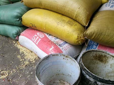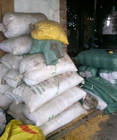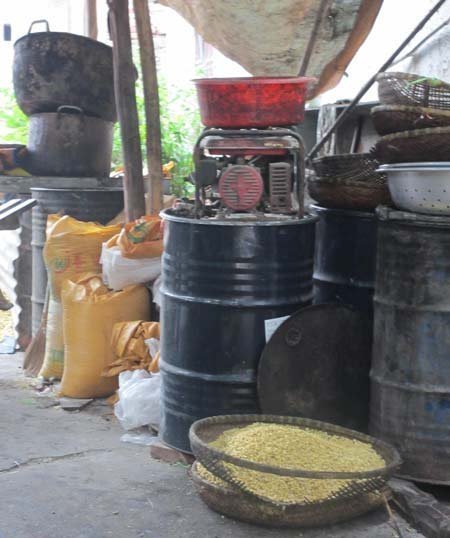 Mọi dụng cụ đều cáu bẩn, dơ dáy, ngô nguyên liệu được để thẳng xuống nền đất bẩn |