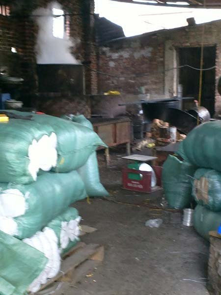 Gọi là xưởng nhưng thực chất khu sản xuất ngô cay của nhà anh D (xã La Phù, Hoài Đức, Hà Nội) chỉ là một căn chòi dựng tạm bợ, rộng khoảng 20m2. Ngô nguyên liệu đựng trong những bao tải, xếp chồng chất ngay gần rãnh nước thải. Ngô hạt, bao tải không vương vãi hoặc chất đống ngay gần lò than. Các loại thùng phi ngâm, chiên ngô han gỉ và đen xì….