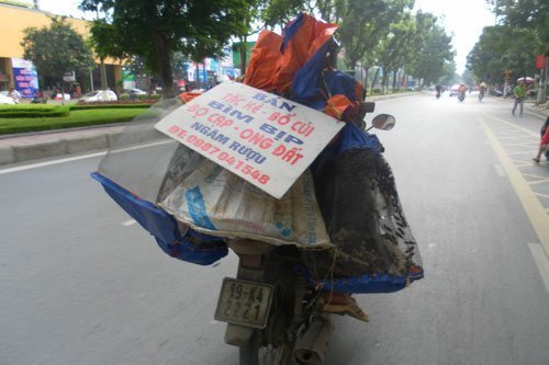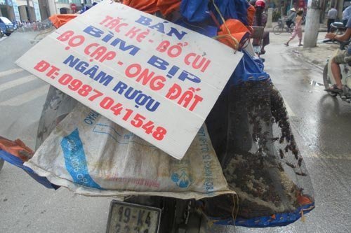 Không khó để bắt gặp cảnh bìm bịp, rắn, bọ cạp, bổ củi “ngồi” trong lồng rong ruổi trên đường phố Hà Nội mà người bán không cần cất tiếng rao. Đồ nghề của họ khá đơn giản, chỉ với một chiếc túi lưới buộc đằng trước cho ra dáng “chuyên nghiệp”, có vẻ như vừa đánh bắt về vẫn “nóng” hôi hổi; một chiếc lồng sắt mắt cáo nhỏ nhốt hàng vừa chắc chắn, vừa tiện “khoe hàng”. Hễ thấy ai chăm chú nhìn, người bán đon đả ngay: mấy con này bổ thận, tráng dương, ngâm rượu trị bệnh nhức mỏi, thư giãn gân cốt cho người già là hết ý. Đồng thời “bồi” thêm: yên tâm đi, hàng của anh toàn là “xịn”, lấy từ rừng Lai Châu, Yên Bái đấy. Loại này uống vào, “một người khỏe, hai người vui”.
