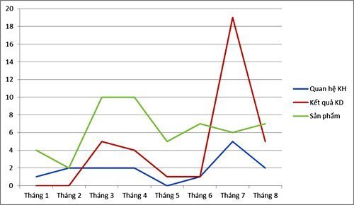 Hình 5: Biến động lượng tin tiêu cực về Sản phẩm/ Kết quả KD/ Quan hệ khách hàng của NHTM Việt Nam trong 8 tháng năm 2012 (đơn vị: coding units)