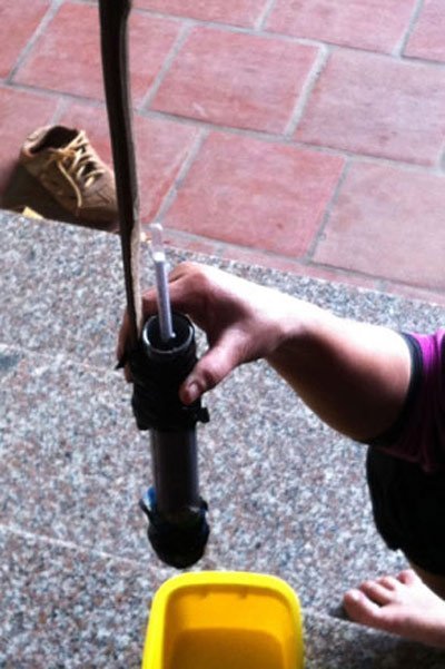 | Ống tre có nhiệt kế đo độ rượu sau khi pha. |