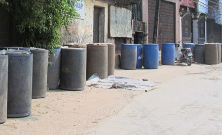| Đường làng tràn ngập phuy rượu và cồn khổng lồ. |
