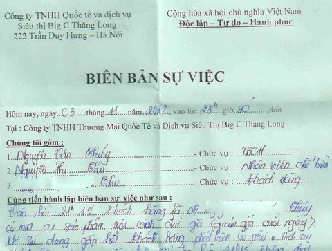 | Biên bản do nhân viên Big C lập nhưng không ký nhận. |