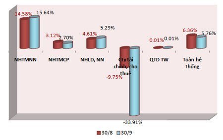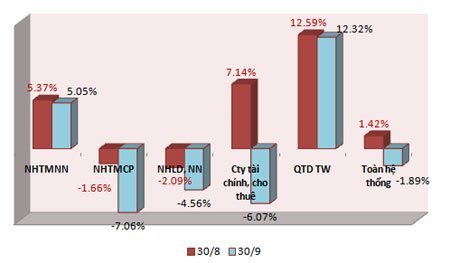 Vốn điều lệ của các tổ chức tín dụng hầu hết giữ nguyên so với tốc độ tăng trưởng cuối tháng 8, riêng vốn của các công ty tài chính, cho thuê sụt giảm mạnh, từ mức tăng 0,15% xuống còn giảm 2,35%.