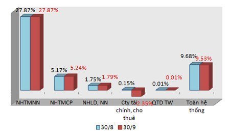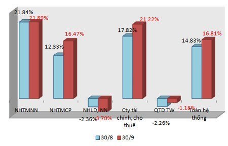 Tỷ lệ an toàn vốn tối thiểu hiện nay cao nhất thuộc về nhóm các quỹ tín dụng trung ương khi lên đến gần 40%, tiếp đến là của nhóm các ngân hàng liên doanh, nước ngoài. Tỷ lệ an toàn vốn tối thiểu của các NHTMCP giảm từ mức 14,15% tại thời điểm cuối tháng 8 xuống 13,95% vào cuối tháng 9.