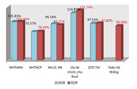 Tỷ lệ cấp tín dụng so với vốn điều lệ tại các công ty tài chính, cho thuê tăng vọt trong vòng 1 tháng qua, từ mức 124,85% tại thời điểm cuối tháng 8 lên 131,74% vào cuối tháng 9. Tỷ lệ này của các NHTMCP tăng nhẹ từ 75,57% lên 76,44%. Tỷ lệ cấp tín dụng so với vốn điều lệ của toàn hệ thống cuối tháng 9 là 90,9%.