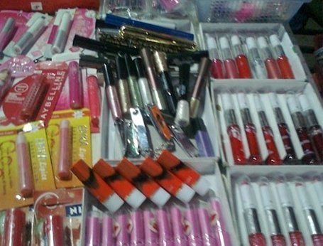 Tại chợ Hôm, quận Hai Bà Trưng, Hà Nội, cả dãy bán quần áo chật chội luôn để dành một ngăn tủ kính bày bán đầy đủ loại mỹ phẩm. Chúng tôi vừa tới nơi, các chị bán hàng đã đon đả: "Mua quần áo hay mỹ phẩm? Son môi hay phấn má? Chị có cả đấy!". Nhìn vào lô mỹ phẩm của chủ kiốt, tôi thấy phần lớn mỹ phẩm đều mang nhãn nước ngoài, ghi tiếng Nhật, Trung Quốc hoặc tiếng Anh mà không có nhãn phụ tiếng Việt.