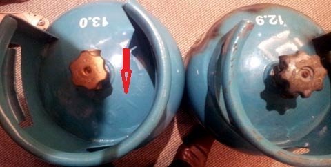 | Bình gas hợp pháp có chữ dập nổi thương hiệu trên vỏ bình (trái) và bình gas có dấu hiệu bị mài (phải) |