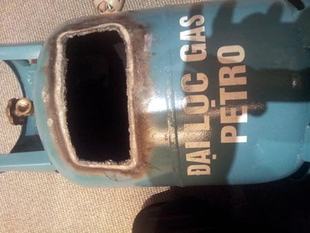 | Chính thương hiệu in dập bên trong đã "tố cáo" chiếc bình gas bị mài và sơn thương hiệu mới |