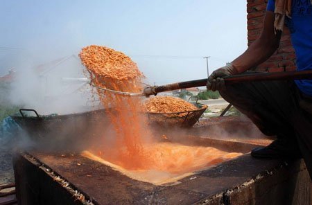 | Ngay cả công đoạn nhuộm màu và vớt tôm cũng là khâu rất vất vả. |