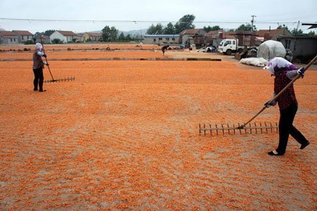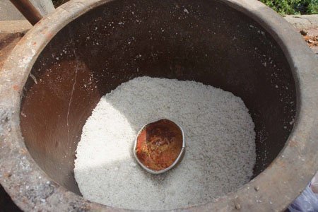 | Tôm sau khi được nhuộm, sẽ được phơi giữa thanh thiên bạch nhật thế này. Người ta có thể vô tư giẫm lên để cào tôm, giúp tôm nhanh khô |