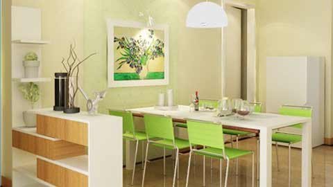 Những phòng ăn nhỏ thường được các KTS tư vấn sơn màu đơn sắc, sau đó bằng việc kết hợp màu sắc nội thất, sẽ đạt hiệu quả về không gian và thẩm mỹ. Tuy nhiên, nếu bạn thích đa màu thì phải tuân thủ quy tắc một bức tường màu đậm thì bức tường khác phải có màu nhạt hơn, hoặc phía trên là màu đậm, phía dưới có thể kết hợp màu trắng.