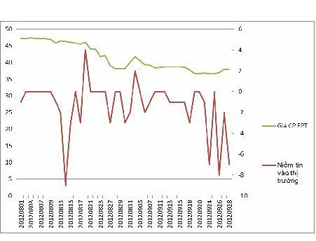 Xét ở cấp độ từng doanh nghiệp niêm yết, ta có thể thấy được mối tương quan tương tự giữa chỉ số niềm tin và chỉ số giá chứng khoán. Một trong những ví dụ điển hình là những thông tin không tốt về ban lãnh đạo của doanh nghiệp có ảnh hưởng tiêu cực tới giá cổ phiếu ngay lập tức. Khi thông tin về CEO Trương Đình Anh của FPT nghỉ phép 2 tháng tràn lên mặt báo, giá cổ phiếu PFT đã bị sụt giảm đáng kể so với giai đoạn đi ngang trước đó. Mức giá cổ phiếu đã giảm tới 20%. Trong trường hợp này, các tin xấu đã xuất hiện khoảng 2 ngày trước khi giá cổ phiếu FPT thực sự sụt giảm.