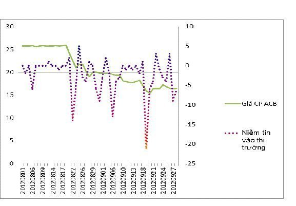 | Hình 3. Biến động của giá cổ phiếu ACB và Chỉ số niềm tin. Nguồn: Dự án đánh giá uy tín truyền thông DNNY do Vietnam Report tiến hành. 3756 tin bài trên 3 nhật báo trong 9 tháng đầu năm 2012 đã được thu thập mã hóa và phân tích. |