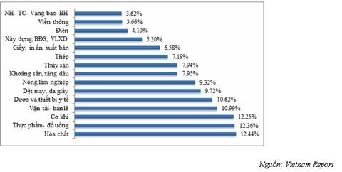 | Biểu đồ 3: Hiệu quả sử dụng tài sản (ROA) năm 2011 của DN FAST500 xét theo ngành nghề kinh doanh. |