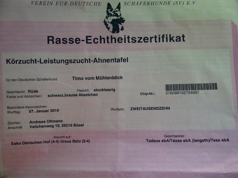 Đối với những chú GSD xuất ngoại, ngoài giấy khai sinh, gia phả, mỗi con còn có hộ chiếu bao gồm những thông tin cơ bản tên tuổi, ngày sinh, nơi sinh, chủ chó, kèm những thông tin liên quan đến kiểm dịch và tiêm phòng thú y tại Đức. Đây được xem là những giấy tờ quan trọng nhất theo GSD suốt đời.