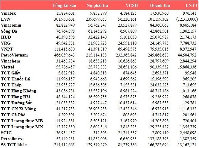 Cũng theo đề án, có đến 30/85 tập đoàn và tổng công ty có tỷ lệ nợ phải trả trên vốn chủ sở hữu cao hơn 3 lần. Đặc biệt có 7 tập đoàn, tổng công ty có tỷ lệ này trên 10 lần gồm TCT Xây dựng Công nghiệp (Tập đoàn Sông Đà), TCT Xây dựng CTGT 1, TCT Xây dựng CTGT 5, TCT Xây dựng CTGT 8, TCT Xăng dầu Quân đội, TCT Thành An và TCT Phát triển đường cao tốc.