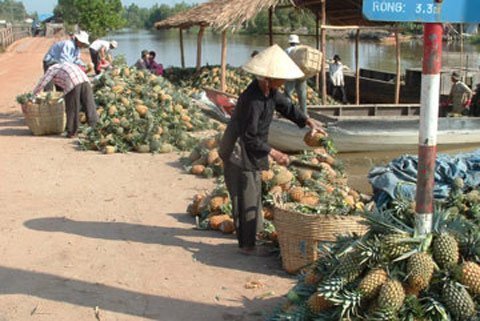 | Nông dân xã Tân Lập 2 (Tân Phước, Tiền Giang) chấp nhận bán khóm cho thương lái người Việt với giá 2.800 đồng/kg chứ không bán cho thương lái Trung Quốc. |