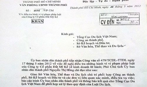 Phó chủ tịch UBND TP Nguyễn Thị Hồng yêu cầu trình UBND TP kết quả điều tra và thông báo cho Tổng cục Du lịch để phối hợp xử lý. Trước đó, Sở VH-TT-DL TP.HCM đã đề nghị Tổng cục Du lịch thu hồi giấy phép kinh doanh lữ hành quốc tế của Đất Mỹ Kế.