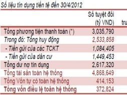 Theo đó, tổng tín dụng tính đến 30/4/2012 là 2.617.320 tỷ đồng, giảm 0,59% so với cuối năm 2011. Trong đó, tín dụng cho công nghiệp chế biến, chế tạo có tăng trưởng 5,19% lên 607.846 tỷ đồng, chiếm tỷ trọng lớn nhất trong tổng dư nợ toàn hệ thống.