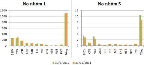 Xét về cơ cấu nợ, điểm đáng chú ý là đến hết quý I/2012, nợ nhóm 1 (nợ đủ tiêu chuẩn) của 10 tổ chức tín dụng giảm so với cuối năm 2011, trong khi nợ có khả năng mất vốn lại tăng.