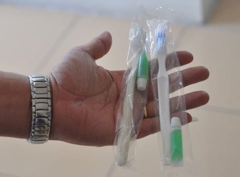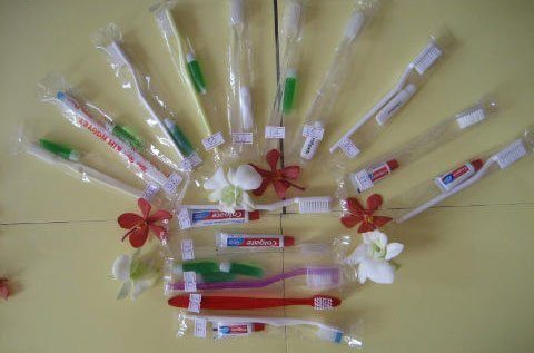 Trong vai người đi tìm nguồn hàng kem và bàn chải đánh răng để phục vụ trong một nhà nghỉ sắp khai trương, chúng tôi hỏi mua loại kem đáng răng dùng trong khách sạn, không hẹn mà gặp, các chủ sạp đều đưa ra một bịch gồm khoảng một trăm tuýp kem đánh răng nhỏ, màu xanh. Tất cả chúng đều kèm theo bàn chải đánh răng, đúng loại chúng tôi cần tìm hiểu. Mỗi tuýp kèm bàn chải như vậy có giá từ 400 đến 600 đồng.