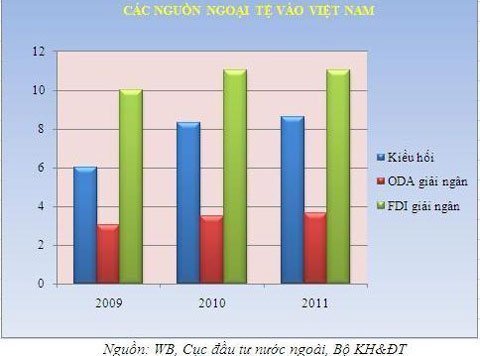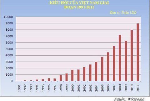 Qua biểu đồ ta có thể thấy, kiều hối là nguồn ngoại tệ quan trọng của Việt Nam. Ba năm liên tiếp trở lại đây, nguồn kiều hối có giá trị bằng 60% tới 76% nguồn vốn FDI và luôn gấp 2 tới 2,4 lần nguồn vốn ODA được giải ngân.