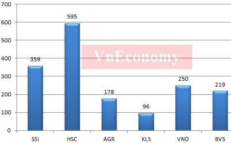 Xét trên hiệu quả tạo ra lợi nhuận của mỗi nhân viên trong 6 tháng, thì trung bình mỗi nhân viên SSI tạo ra 922 triệu đồng lợi nhuận, vượt trội so với mức 520 triệu của mỗi nhân viên KLS, gần 300 triệu đồng của mỗi nhân viên BVS, hơn 275 triệu đồng của mỗi nhân viên HSC, gần 270 triệu đồng của mỗi nhân viên AGR và 240 triệu đồng của mỗi nhân viên VND.