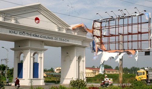 | Bên cạnh cổng chào bề thế là biển quảng cáo dự án rơi tả. (Ảnh: D.A) |